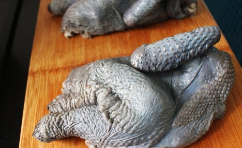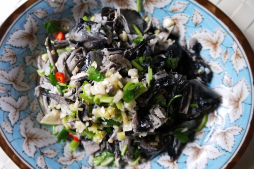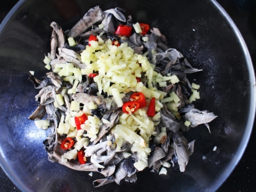 步骤6、将凉了的乌鸡肉用手撕成条,加入姜蒜末,小米辣