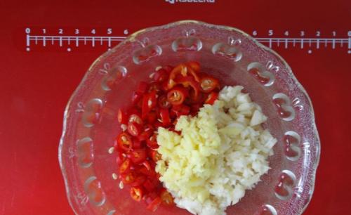 步骤4、取姜切成末,蒜切末,小米辣切成细碎