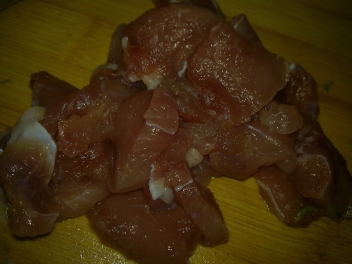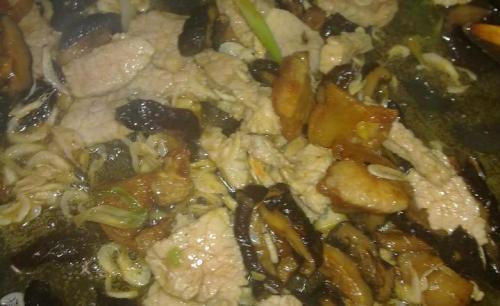 步骤11、然后就把瘦肉倒进去翻炒,加点盐,鸡精,生抽,料酒