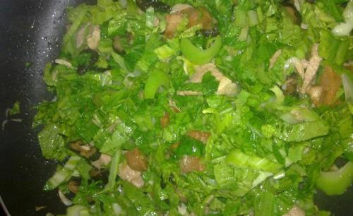 步骤13、芥菜梗炒的软一点就把菜叶倒进去炒,菜叶翻炒几下就可以了