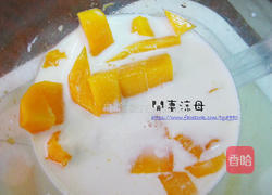 步骤2、爱文芒果一颗半,加上牛奶跟适量的蜂蜜