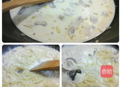 步骤4、然后依序加入牛奶、鲜奶油、盐煮滚,放入面条拌煮一下,最后放入蛤蛎和白酒,蛤蛎壳开了,就起锅,呈盘后撒上意式香料和黑胡椒就很好吃了