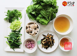 步骤2、菜洗净后,茼蒿切段、韭菜切段、芹菜切粒、香菜茎叶分开切;虾米泡水;香菇泡水泡软后,切丝;贡丸切四块;红葱头切粒