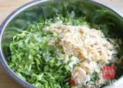 步骤4、切成末,虾皮洗净,倒入其中,调入适量盐和香油调味,搅拌均匀成馅。