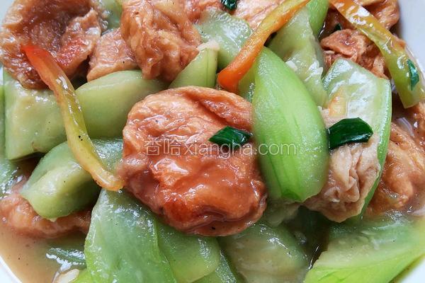 步骤3、倒蚝油,放入油面筋加少许水,盖上盖焖炒三、四分钟