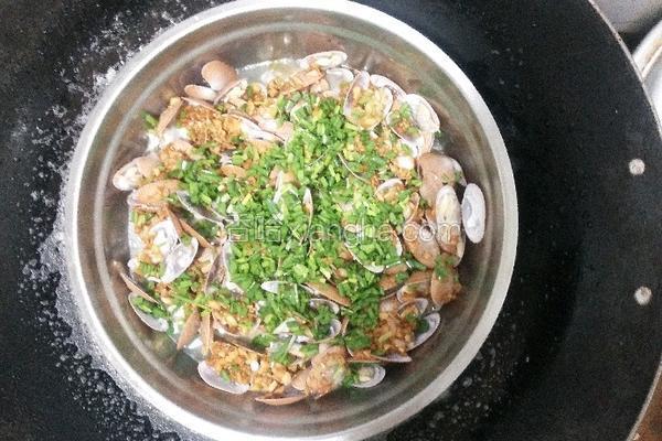 步骤7、水锅中放进花甲蒸开,淋上炒好的蒜酱,葱花就可以出锅了