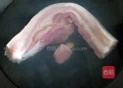 步骤2、把洗干净的五花肉和两片姜片放入冷水锅中,煮开水后持续煮3-4分钟,将血水除尽
