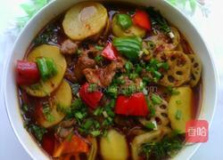 步骤10、图8的土豆,藕煮好后,用漏勺捞到豆芽上,底汤在煮肉片,煮好连汤一起浇上土豆上面就可以了,