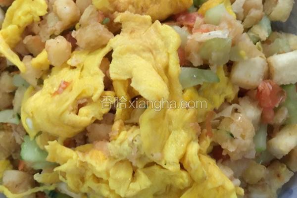步骤6、另起锅,放油炒西红柿,待西红柿炒软出汁时,放入黄瓜翻炒,做后将鸡蛋馒头丁倒入翻炒,放入适量的盐。出锅啦。