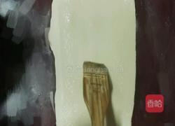步骤3、用擀面杖将面团擀成厚度约为0.3cm的长方形,并用油刷均匀的刷上一层色拉油。