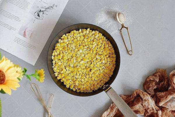 步骤3、 拌匀,让玉米粒均匀的被淀粉包裹住。