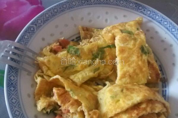 步骤5、倒入三分之一搅拌好的鸡蛋 平铺锅底