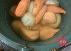 步骤5、把烘好的红薯放进锅里,用一切办法蒸熟,像这种大锅就要注意边上不要放红薯,以免温度过高考焦红薯。看吧,我犯错了。多弄几次就有经验了,这是我刚开始做摸索经验的时候照的,从做冬瓜糖得到的启发,本女今年已经弄了3麻袋红薯了,哦呵呵呵。。。(余音袅袅)