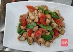 步骤5、下油倒入大肠爆香后,加入青椒,红椒,葱头,姜片,蒜子片一起炒,再加入胡椒粉。最后加入生抽即可。