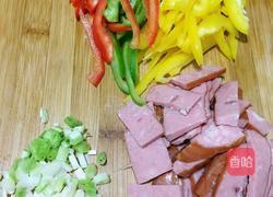 步骤2、彩椒切丝、烤肠切片、葱蒜切碎