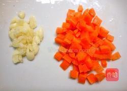 步骤2、胡萝卜去皮清洗干净、切粒、蒜去衣清洗干净、拍碎