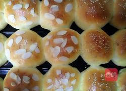 步骤8、发酵好后把面团和热水从烤箱里拿出来,烤箱175度预热,把面团表面刷上蛋液,然后撒上白芝麻或扁核仁片,把烤盘放中层上下火20分钟,叮!出炉啦!