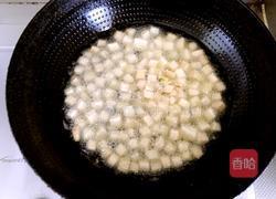步骤5、放入炸熟后的杏鲍菇丁翻炒均匀。最后调入淀粉、盐、胡椒粉和生抽调好的料汁,翻炒均匀即可。
