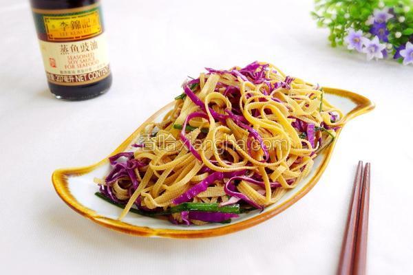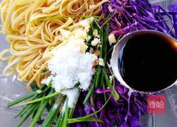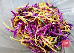 步骤4、菜板用开水烫过,将紫甘蓝、豆腐皮、青蒜叶控水后切丝(紫甘蓝硬梗去掉不用),蒜切末,全部放入容器内