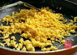 步骤13、锅中倒适量油,炒鸡蛋,也可以用刚才熬好的油炒,油不太热时就倒入鸡蛋,边升温边搅动鸡蛋液,搅动过程中鸡蛋液也慢慢凝固,当鸡蛋液全部凝固时就关火,用锅铲将鸡蛋压得更细碎一些。