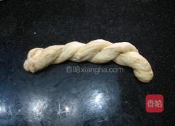步骤10、把麻花盘起来,放入模具中,发酵至1.5倍大,然后表面刷上蛋液。