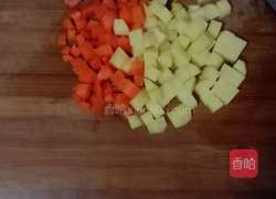 步骤3、锅中放少许水,倒入土豆、胡萝卜丁和毛豆,煮3-5分钟(喜欢硬点的可以少煮会)后捞出,沥干水分;