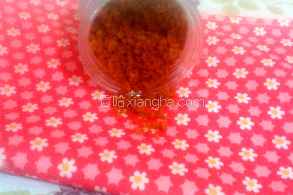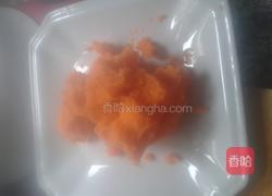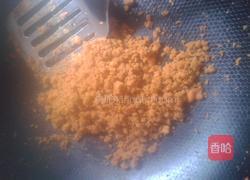 步骤4、锅中放油下胡萝卜渣小火炒放入调料继续炒,炒至胡萝卜渣水分干颜色从橙色变金黄色