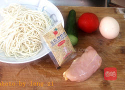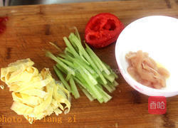 步骤3、黄瓜去皮切丝、西红杮切片、鸡胸肉切丝,蛋皮切丝。