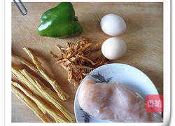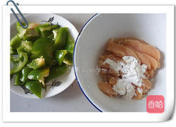 步骤2、鸡胸切片用淀粉上浆,青椒切片。