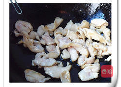 步骤6、葱姜蒜炝锅,放入鸡胸煸炒,倒入料酒,蚝油,放入少许盐。
