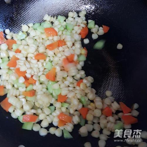 步骤6、然后放玉米粒,最后放黄瓜丁翻炒