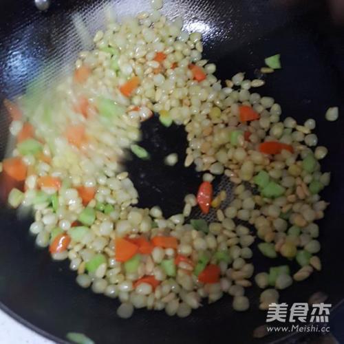 步骤5、锅里放入胡萝卜丁转中火快速翻炒一下