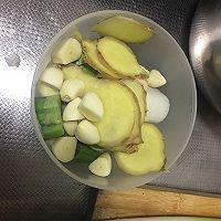 步骤9、 生姜切厚片8片、蒜6瓣对半切、葱段6段备用。