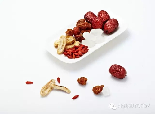 步骤1、将海底椰10g提前浸泡2个小时,将海底椰、桂圆肉10g、枸杞5g、红枣20g洗净放入养生壶中,加水至1200ml,启动养生汤模式。