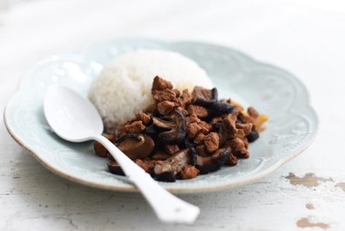 步骤2、将焯熟的五花肉切小丁,姜切片,葱切段,香菇切丁。