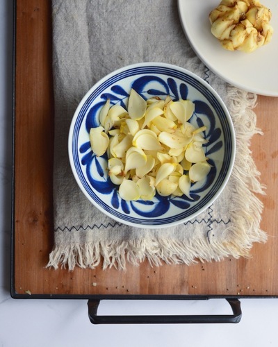 步骤1、红薯去皮切滚刀块,百合掰开,洗净。