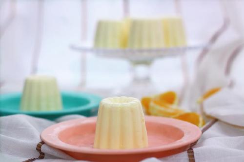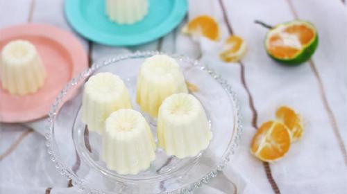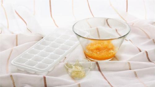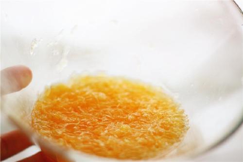 步骤2、首先制作橘子夹心:泡发吉利丁隔热水融化,倒进橘子果肉果汁的混合物中;填在冰格中冷冻即可。材料中的分量可做8-9个正常冰格。