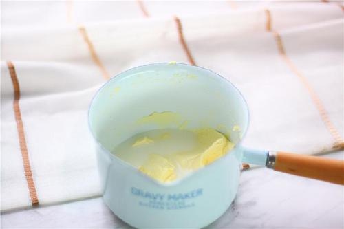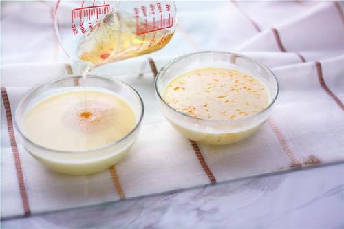 步骤5、吉利丁隔热水融化,加入到慕斯液中(因为是和果肉版的一起做,就一起拍了,大家可以忽略右边那碗东西);