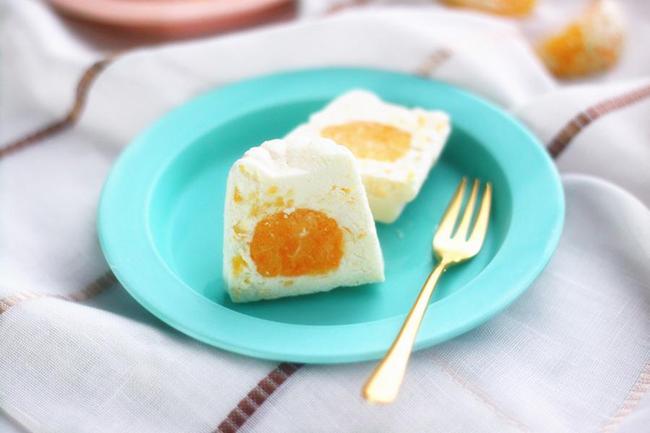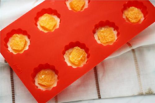 步骤8、拿出之前冻好的橘子夹心,放入模具中间; 拿一个大小相当的小案板垫在模具底部, 再倒入剩余慕斯糊,送入冰箱冷冻至少2小时以上才可脱模;(硅胶垫很软,不垫案板是没办法平整的拿起来的)。橘子夹心要注意别高过模具顶部哈,装填的时候多看一下,放置好后再倒慕斯糊。