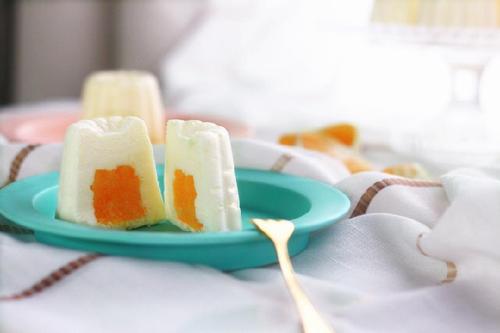 步骤10、小小的,QQ的,萌萌哒!将脱模的慕斯在冷藏回温后就能享用啦,切开之后也很好看,颜色分明,口味丰富;