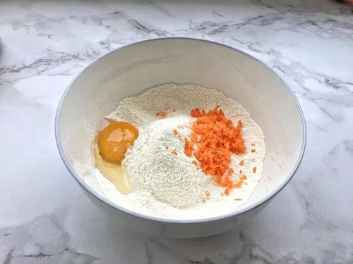 步骤4、低筋面粉过筛,加入蛋黄、胡萝卜碎与低筋面粉混合,用筷子搅拌成雪花状。
