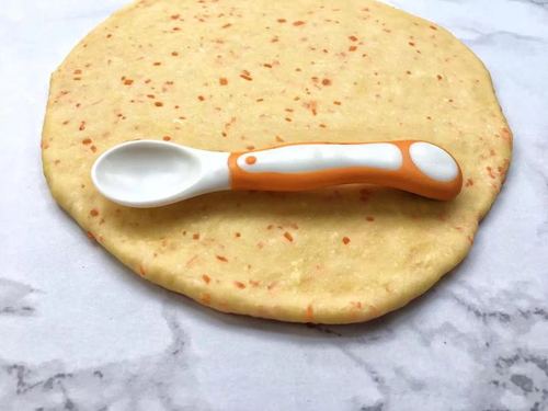 步骤6、用擀面杖把面团擀成5mm厚的圆片,用勺子放在面片上量度切割成勺子的模样。再用勺子前端给面胚按压凹造型。