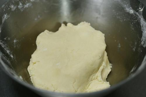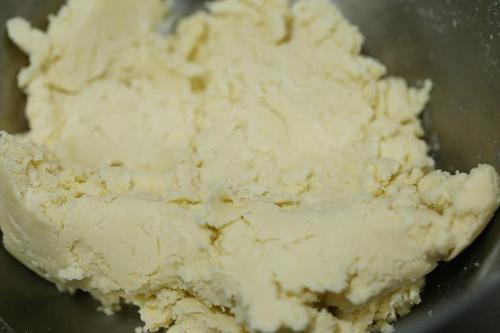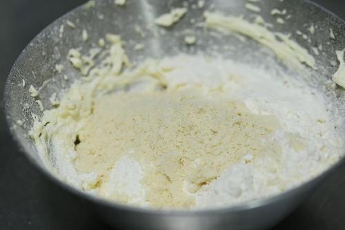 步骤3、加入过筛的面粉还有杏仁粉用刮刀拌匀成一个粗糙的面团;