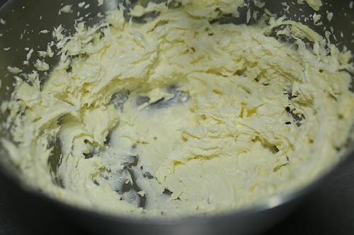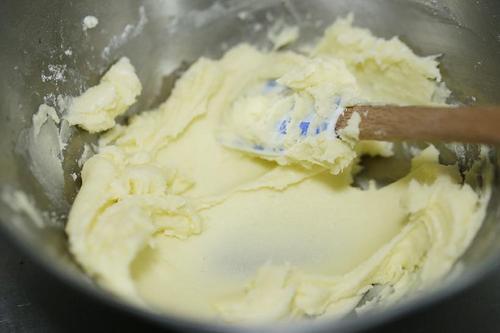 步骤1、将软化的黄油和糖粉放入搅拌盆中用刮刀按压拌匀;烤箱190℃预热;