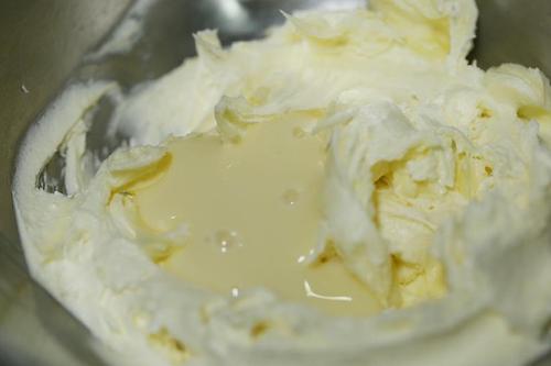 步骤2、用电动打蛋器打到体积蓬发颜色发白,加入炼乳搅打吸收;