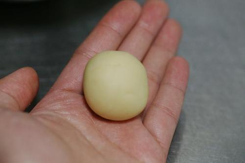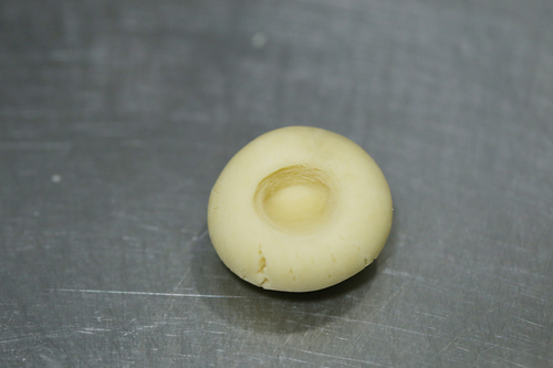 步骤4、将面团用手按压成型,分成20g一个的小份面团,用掌心搓圆,用食指在中心位置按一个洞;