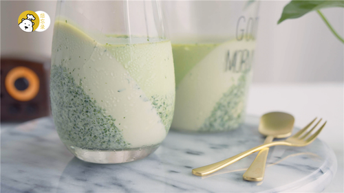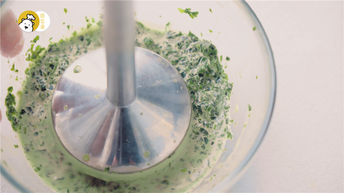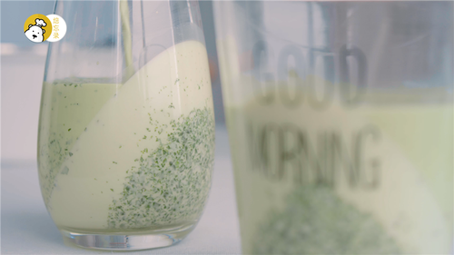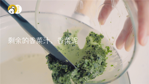 步骤7、TIPS: 1、视频中的是比较香菜碎的状态,所以在冷藏过程中会有一些沉淀,最终形成很好看的几何形状;不在乎形状的胖们可以把香菜达到完全碎掉的状态,就不会有沉淀啦; 2、剩余一半奶液如果在加入之前有一点变稠,可以开火稍稍即热半分钟,重新让吉利丁化开就好了。 3、如果是使用烤碗当容器,可以用速冻来减少等待时间;但如果使用的是普通玻璃杯,就老老实实用冷藏,因为冷冻可能会让杯子碎裂。