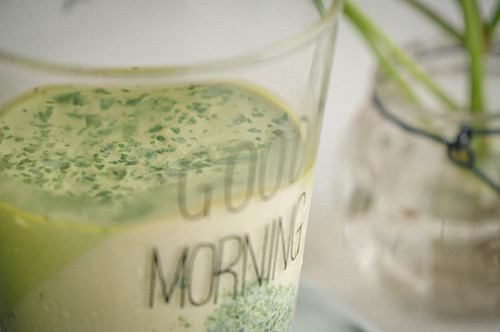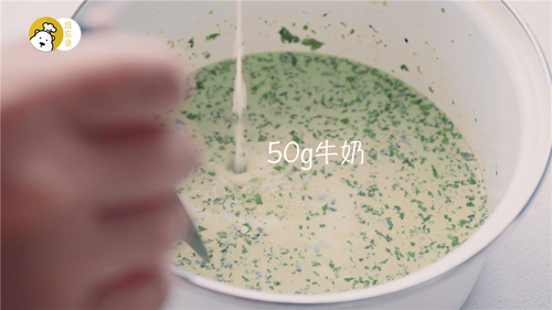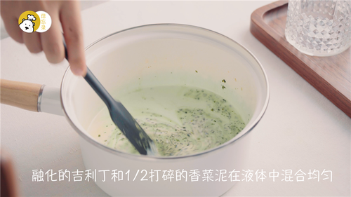步骤3、加1/2打碎的香菜泥、隔水融化的吉利丁液,一起倒入奶液中搅拌均匀;