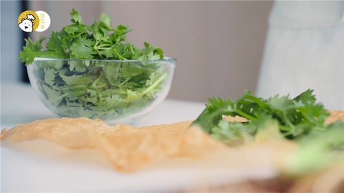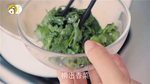 步骤1、吉利丁片冰水泡发;拿出一大把香菜,取柔软的脉、叶部分使用;