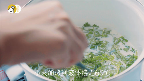 步骤2、200g牛奶(剩余50g备用)、奶油、细砂糖与香菜混合,小火加热到液体不超过60℃;然后捞出奶液中的香菜,用手持料理机打碎;